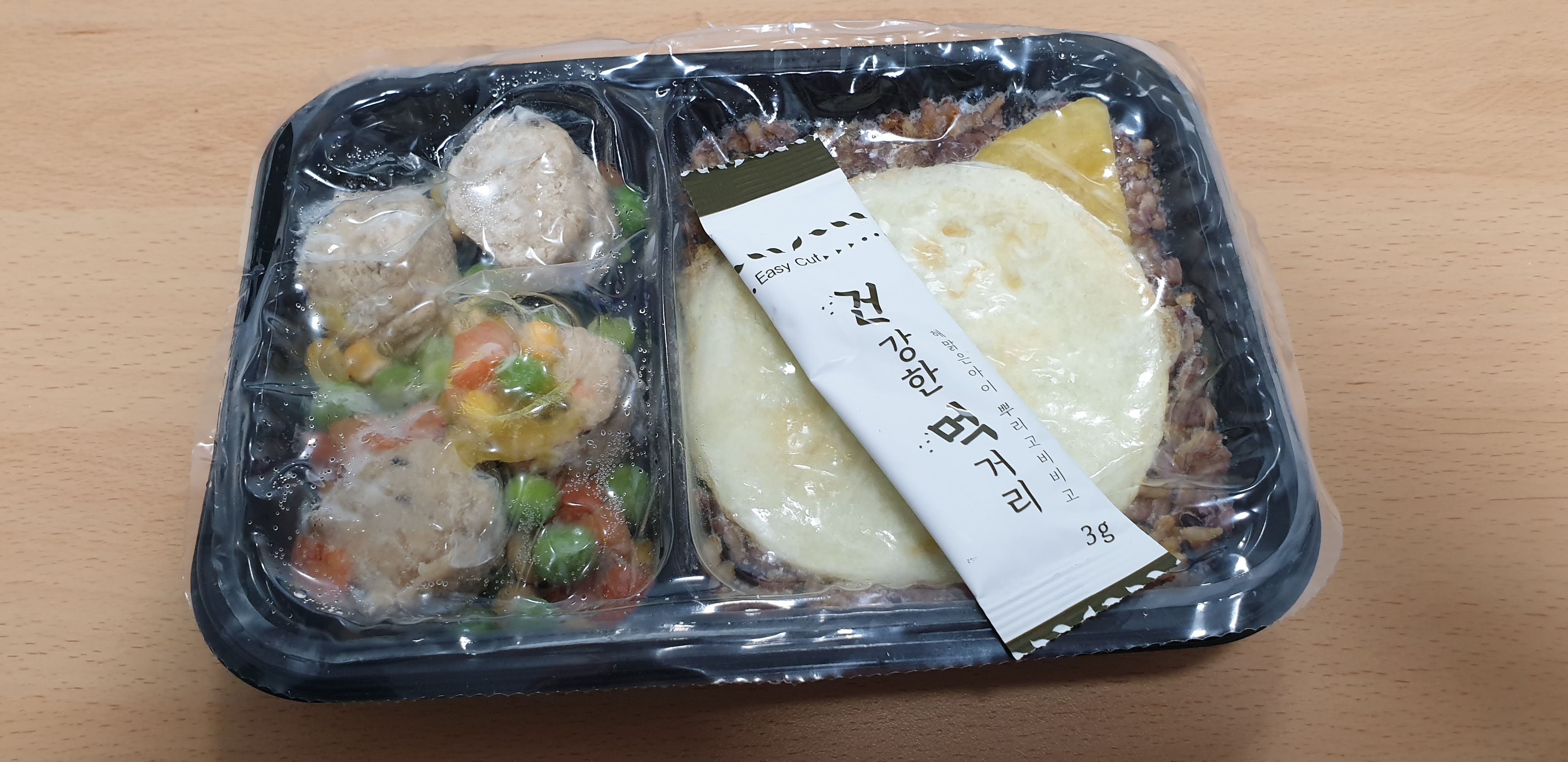 구성은 흑현미밥, 고구마, 계란흰자로 되어 있으며, 김가루스틱이 포함되어 있는데, 뿌려서 먹어봤습니다.