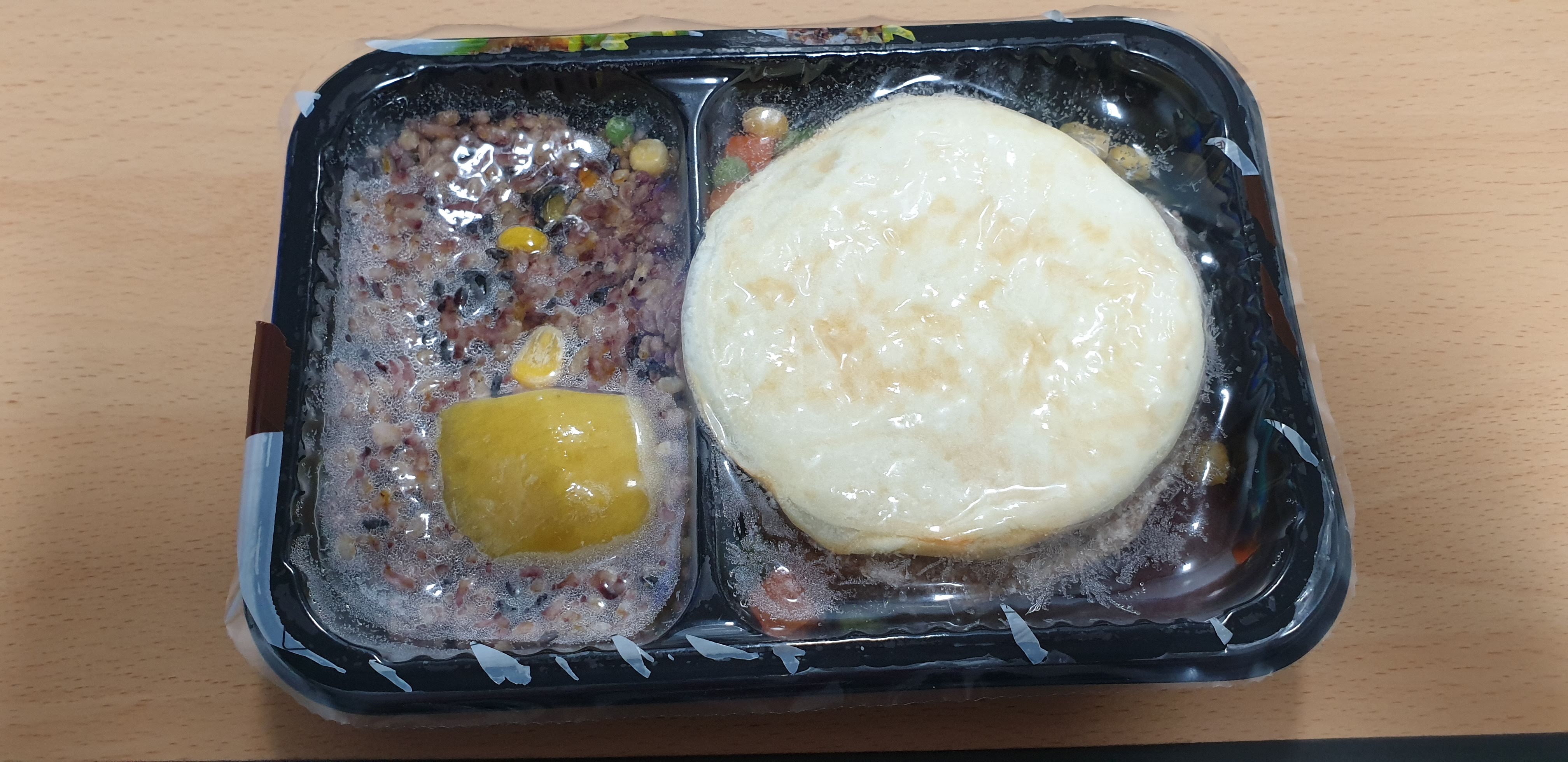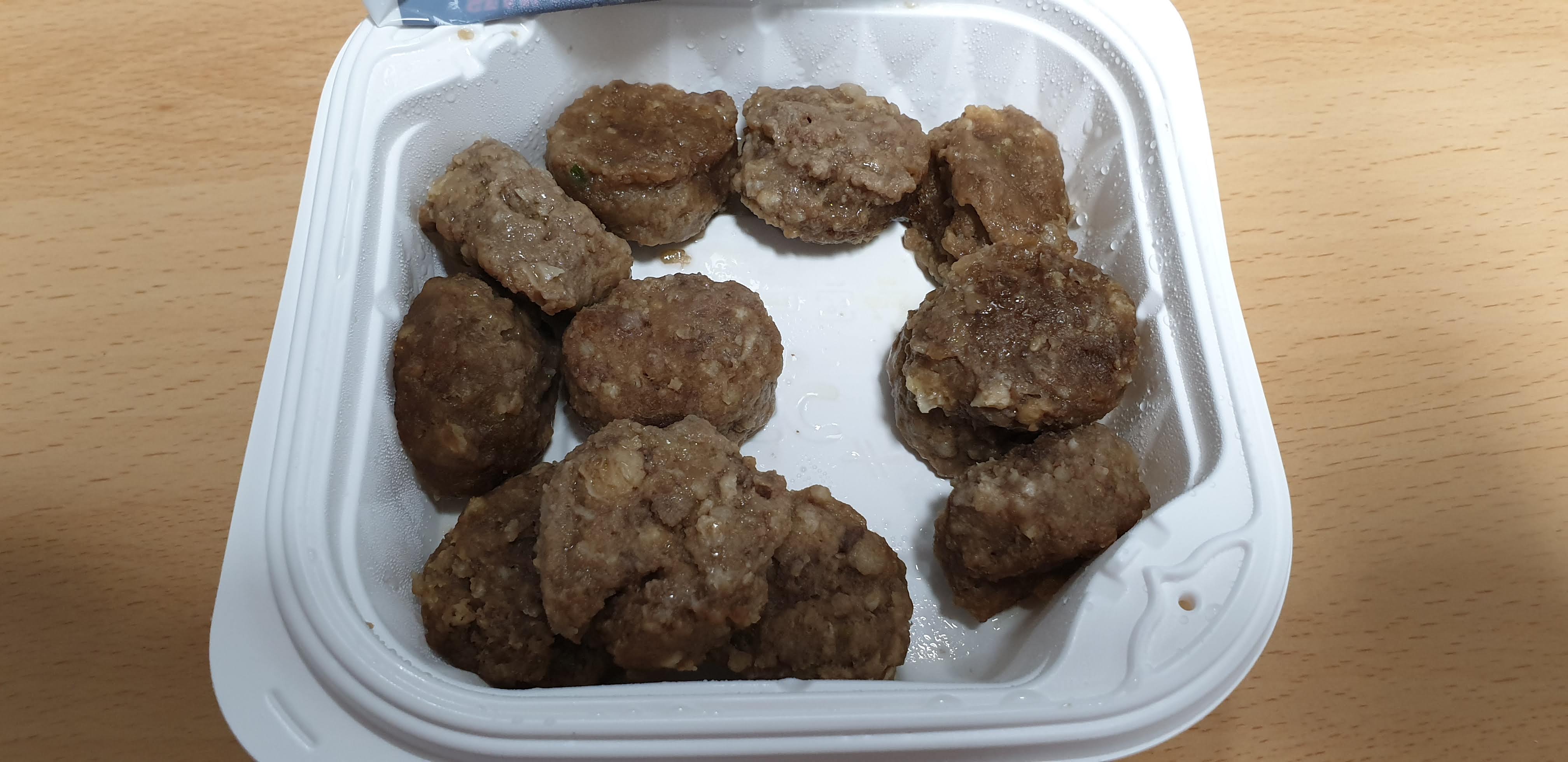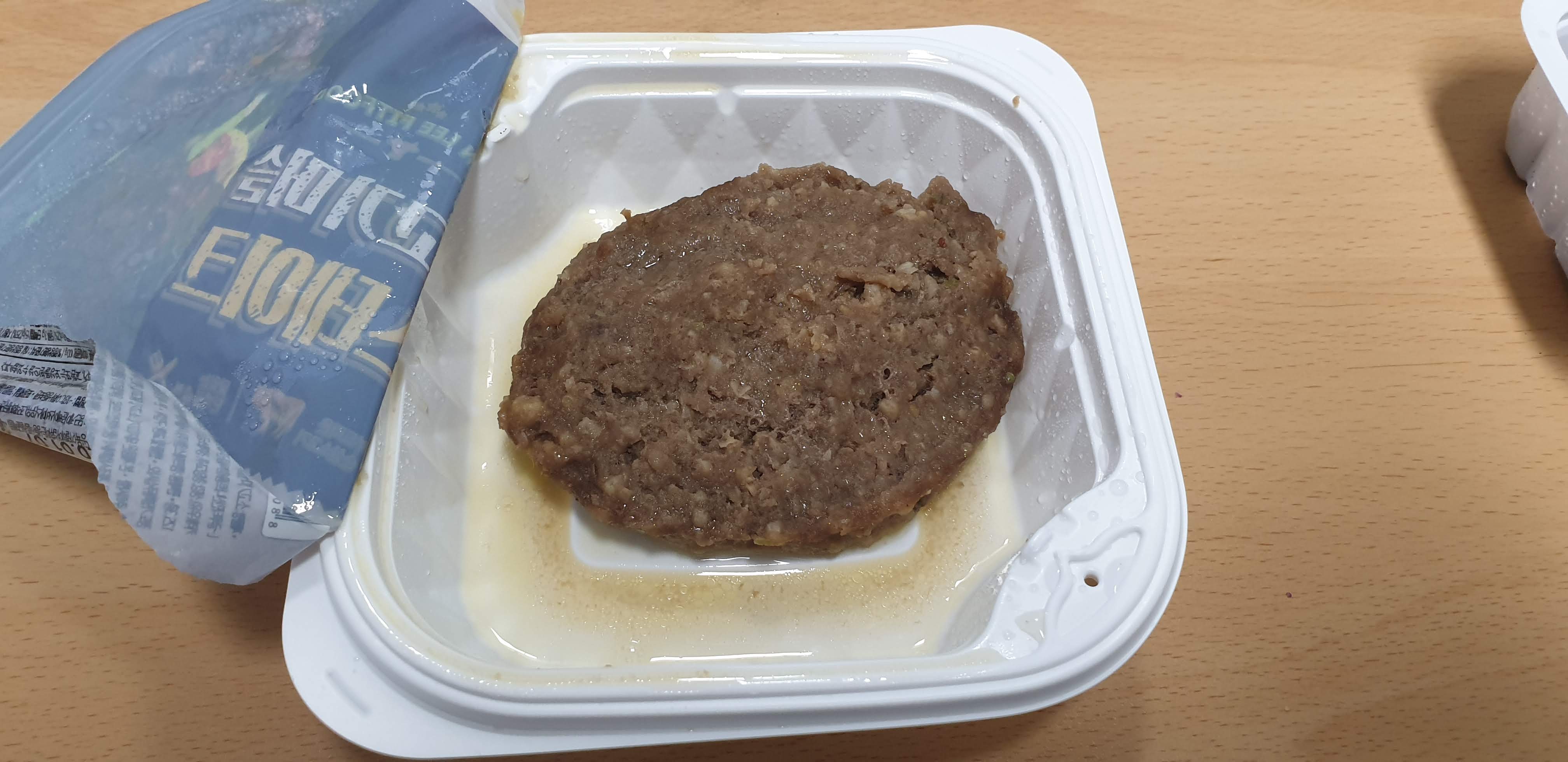 씹는 느낌은 햄버그 스테이크에 스타일이며, 맛은 뚝배기불고기가 물기없이 뭉쳐있는 느낌입니다. 간은 제법 짭짤하며, 고기 안에 식감을 위해서 인지 소 힘줄 식감이 나는(질긴?) 것들이 섞여 있습니다. 전자렌지에 너무 오래 돌리지 않고 먹으니 육즙도 남아있고 괜찮네요.