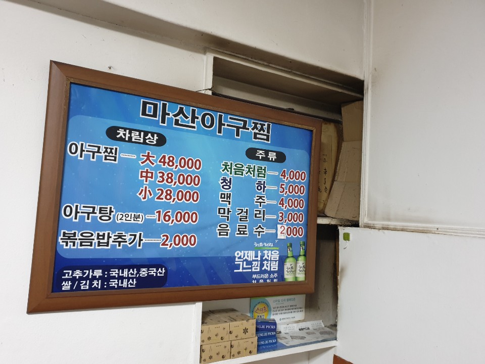 메뉴는 아주 심플합니다. 아구찜, 아구탕 2가지 입니다. 대중소 가격을 보면 무지 쌉니다.