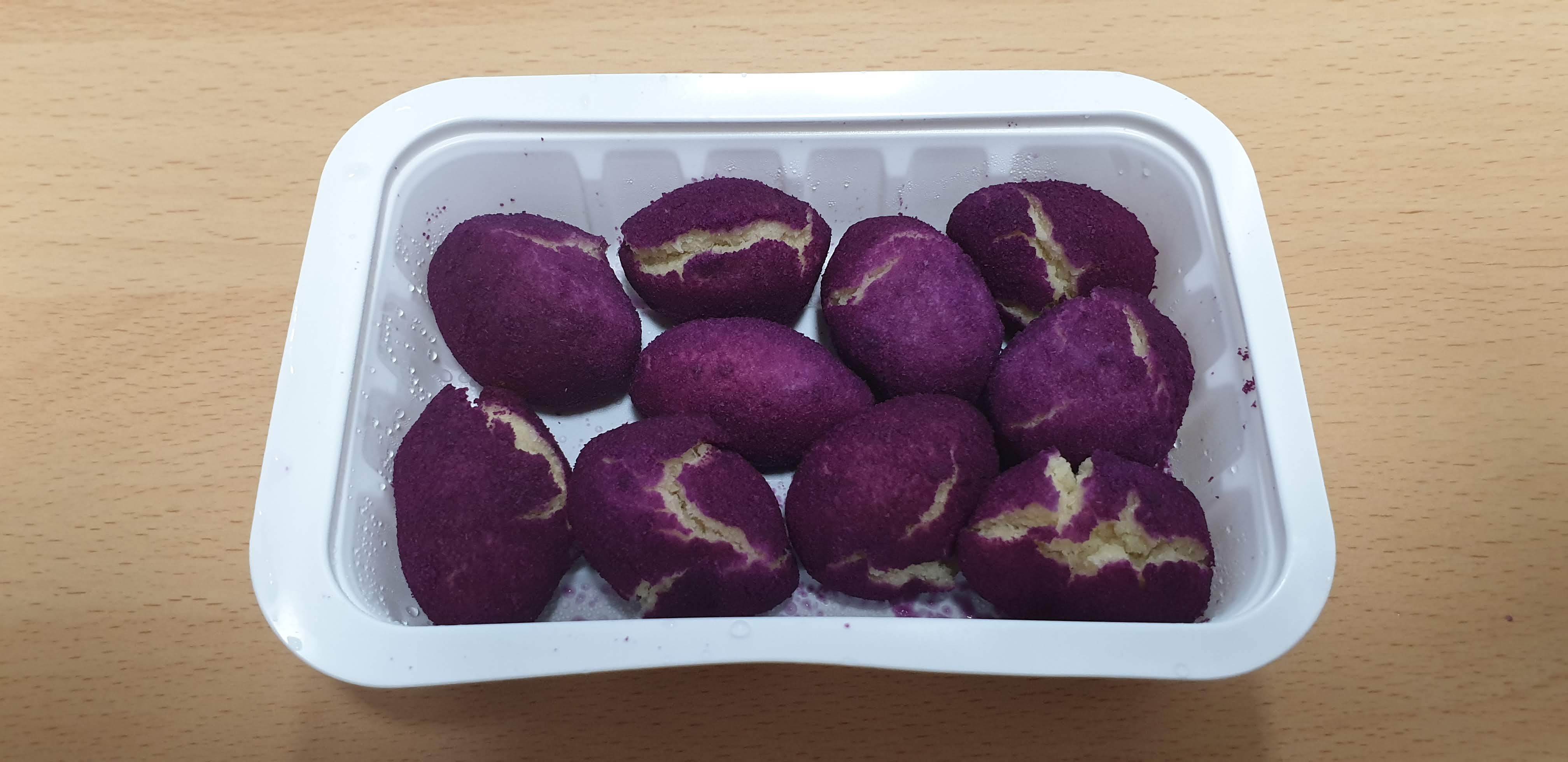 평범한 고구마인데, 생고구마가 아니라 고구마 갈은 것을 뭉쳐서 겉에 자색의 가루를 뿌린 것으로 보입니다. 맛은 전자렌지에 조금 돌리면 부드럽고, 많이 돌리면 겉이 밤고구마처럼 단단해집니다. 전 전자렌지에 돌린 후 식혀서 먹습니다. 식감은 호박고구마와 밤고구마의 중간정도 입니다.