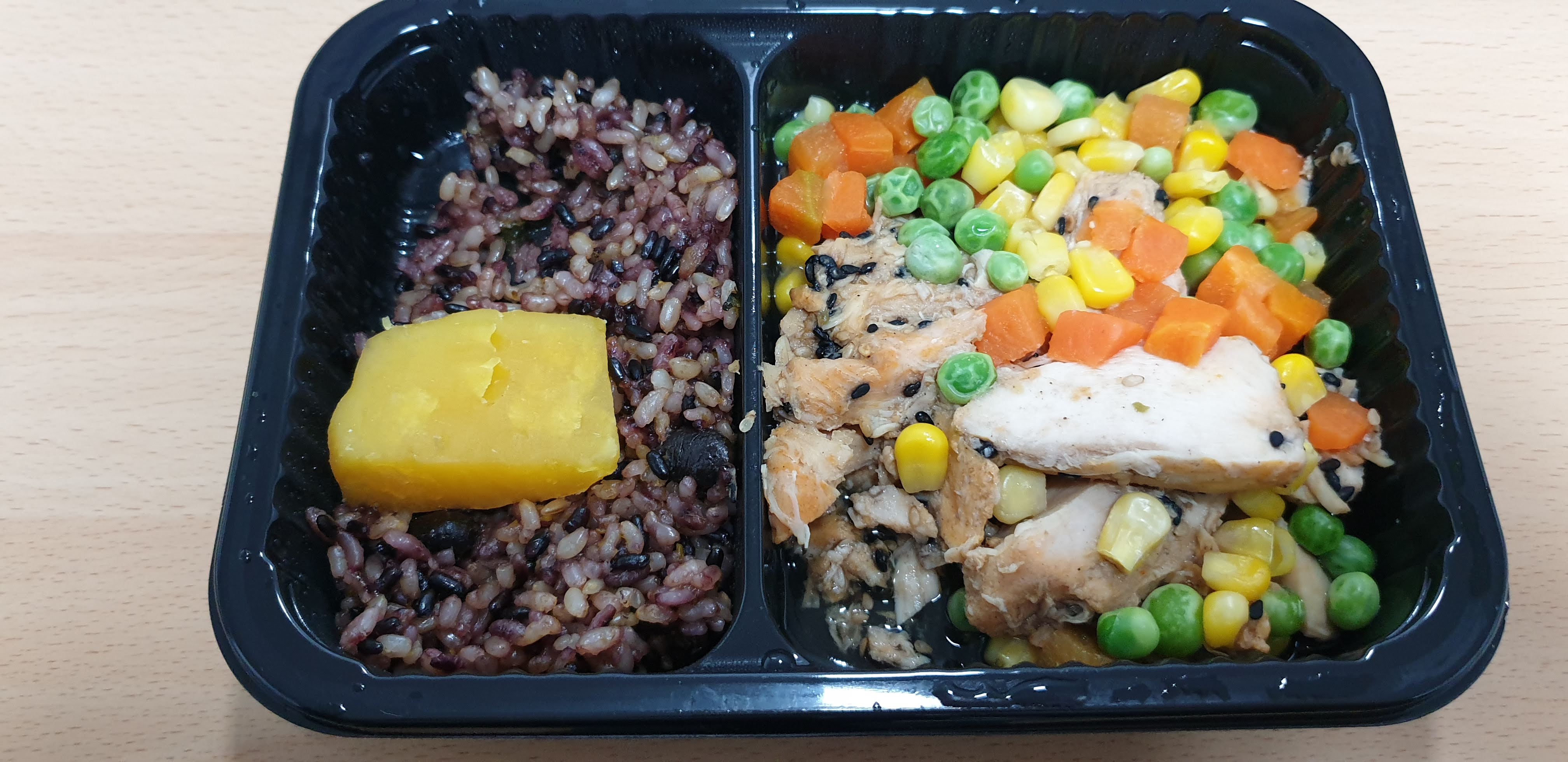 나. 칠리 닭가슴살 - 역시 오른쪽부터 보면 보라색 고구마 가 눈에 띕니다. 맛은 일반 고구마보다 조직이 치밀하지 않아서 잘 부스러지네요.먹기 좋습니다. 퍽퍽하지 않고 밑에 콩들은 촉촉하지도 뻣뻣하지도 않습니다.