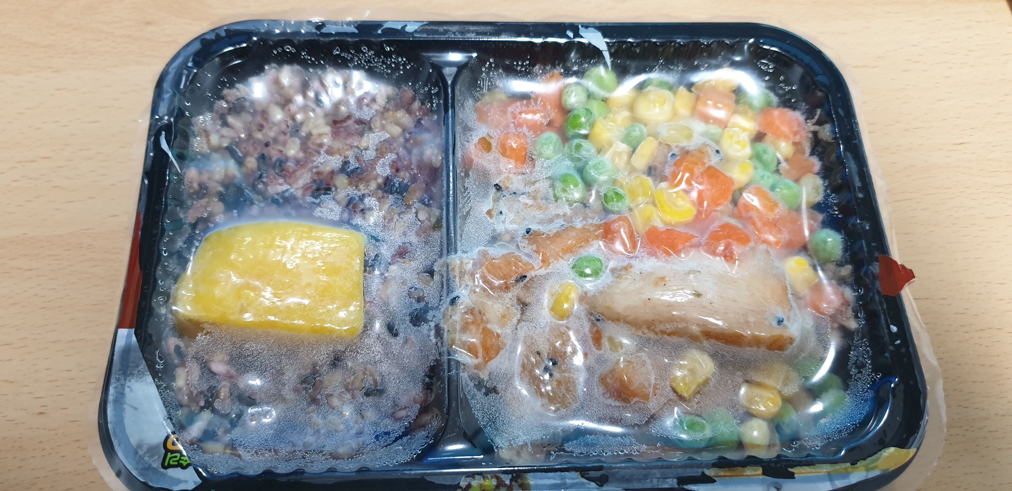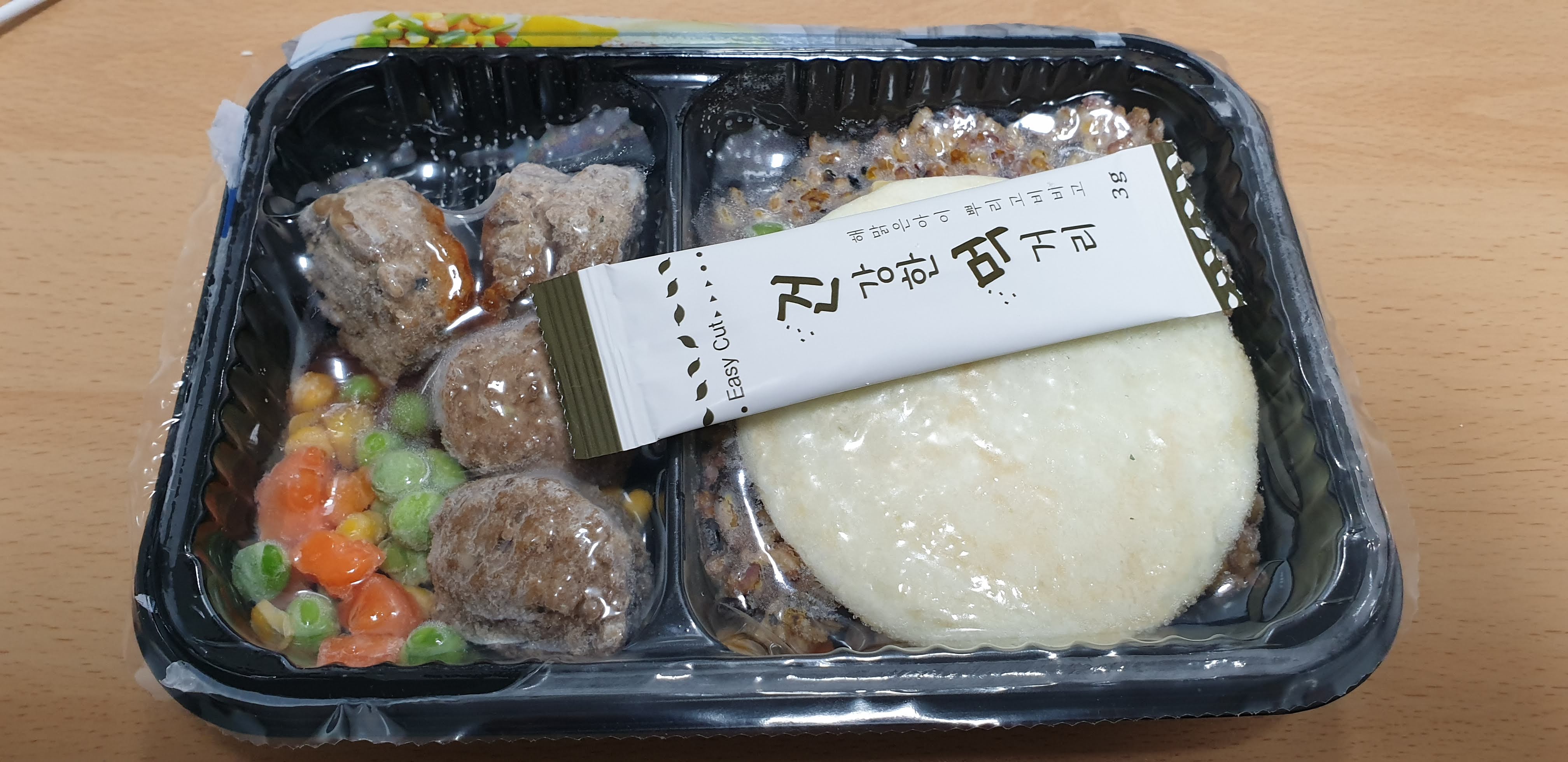 이건 씹는 맛있다고 해야할지 아니면, 이물질 느낌이라 해야할지 ㅎㅎ 그닥 반갑지는 않습니다. 이쪽은 확실히 고온어도시락이 훨씬 좋습니다. 같이 있는 야채들은 언제나 들어있는 완두콩, 당근, 옥수수 입니다.